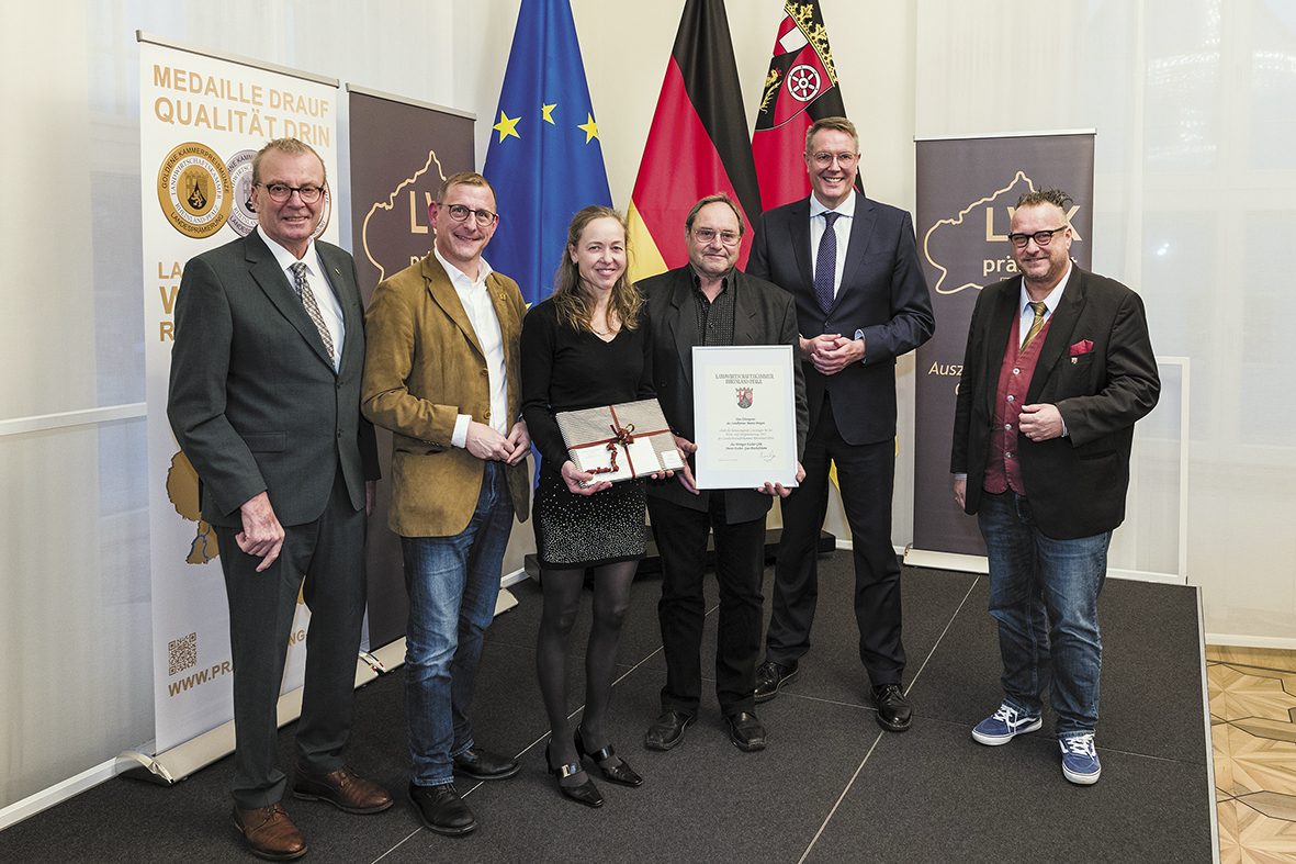 v.l.n.r.: Ökonomierat Michael Horper (Präsident der Landwirtschaftskammer Rheinland-Pfalz), Thomas Barth (Landrat des Landkreises Mainz-Bingen), Petra Escher, Toni Escher, Alexander Schweitzer (Ministerpräsident des Landes Rheinland-Pfalz, Andy Becht (Staatssekretär im Ministerium für Wirtschaft, Verkehr, Landwirtschaft und Weinbau)
