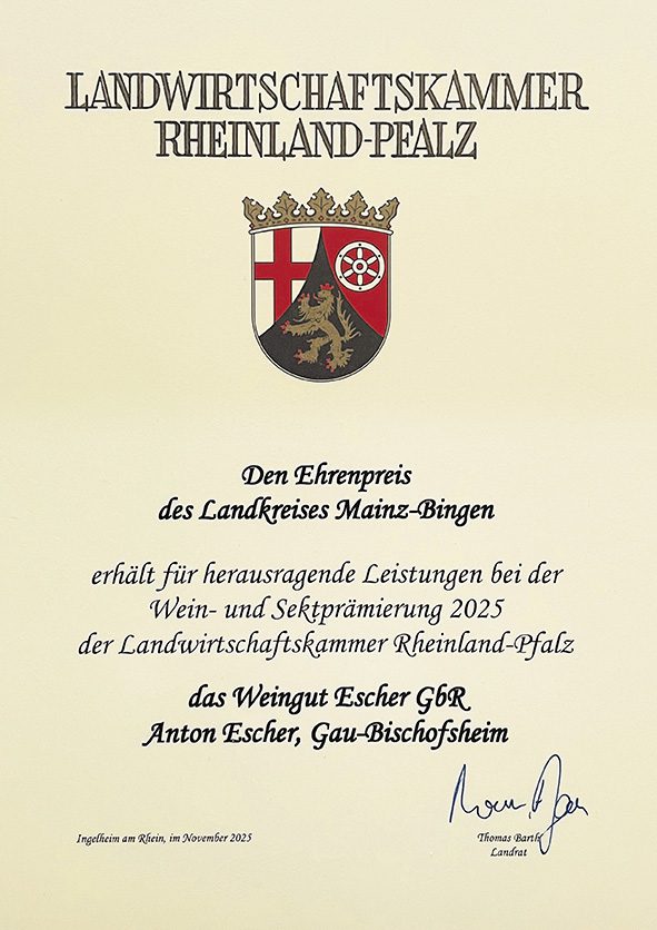 Den Ehrenpreis des Landkreises Mainz-Bingen erhielten wir am 28.11.2025 im Rahmen der Weinprämierungsfeier der Landwirtschaftskammer Rheinland-Pfalz in der Mainzer Staatskanzlei.
